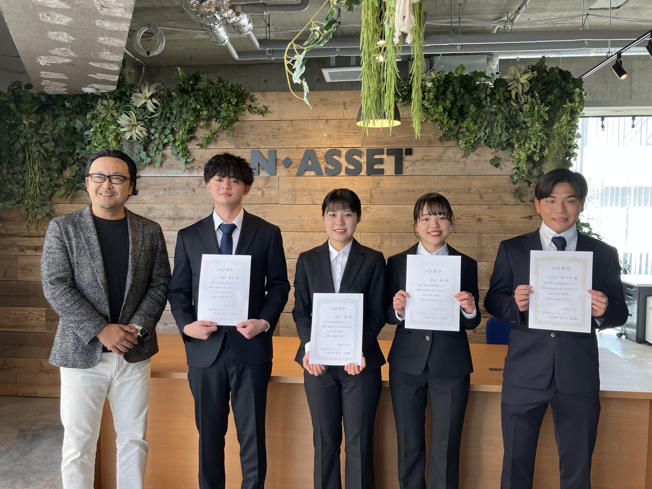 2023年5月9日その他 オーナー様相談室入社式を行いました2023年4月1日(土)、エヌアセットでは2023年度の入社式を行いました。本年は4名の新卒社員を迎え入れています。入社式では代表の宮川よりエールと共に辞令を交付し、4名は新社会人としての一歩を踏み出しました。これから約2ヵ月間は社内外の研修を行い、6月よりそれぞれ配属部署での業務がスタートします。新たな門出が重なる4月、エヌアセットに入社した新たな仲間と共に成長できるよう社員一同努めて参ります。【入社式の写真】