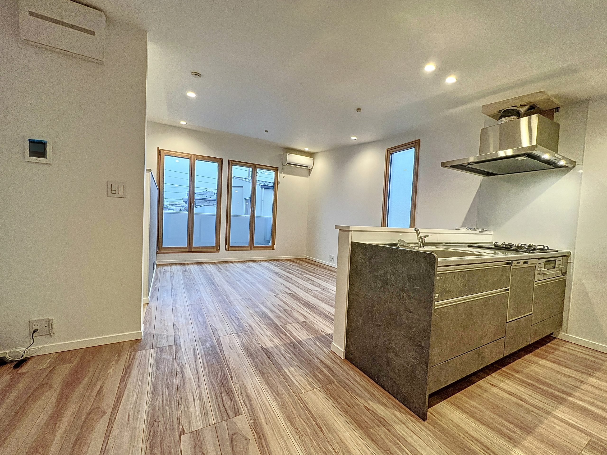 今回の新築は2階建・3戸のメゾネット住宅。2LDKのお部屋と、土間スペースとウォークインクローゼットを設けた1LDKタイプの2パターンが作られています。採光の確保や外観デザインの観点からあえて各住戸の配置を少しずらしている点や、全体の配色、導入設備など弊社スタッフよりこだわりポイントをご説明させて頂きました。