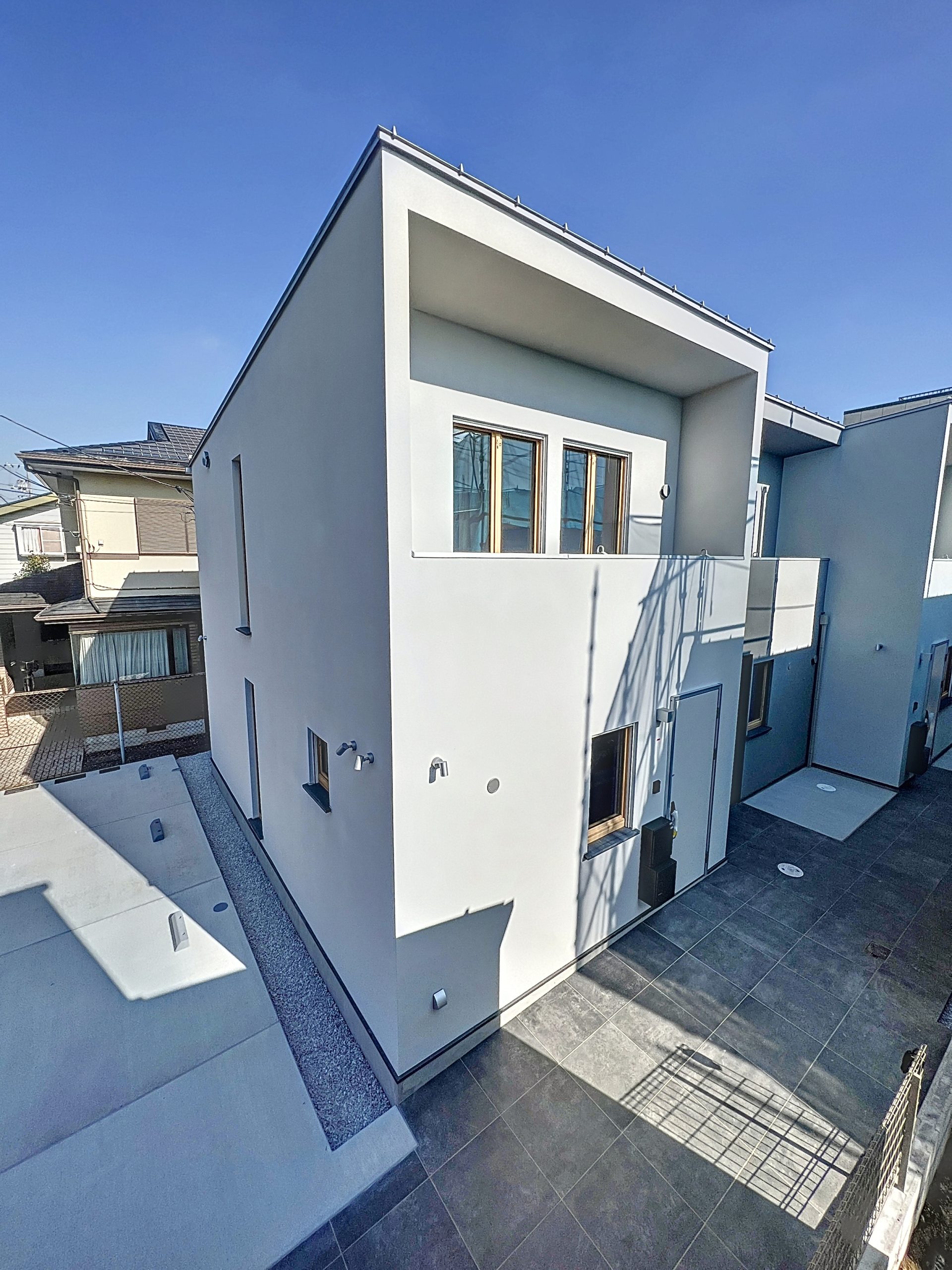 また、今回の新築物件は建物のプランの細部にこだわって建てられていること以外に、まず土地全体の将来の活用の検討から始められている計画となります。具体的には所有地内にご自宅、ご親族のご自宅、今回の新築と3物件を計画するにあたり、将来的に売却することとなった場合に備え、戸建分譲地として分割しやすい区画を想定した上で、それぞれの建物の配置を企画しています。