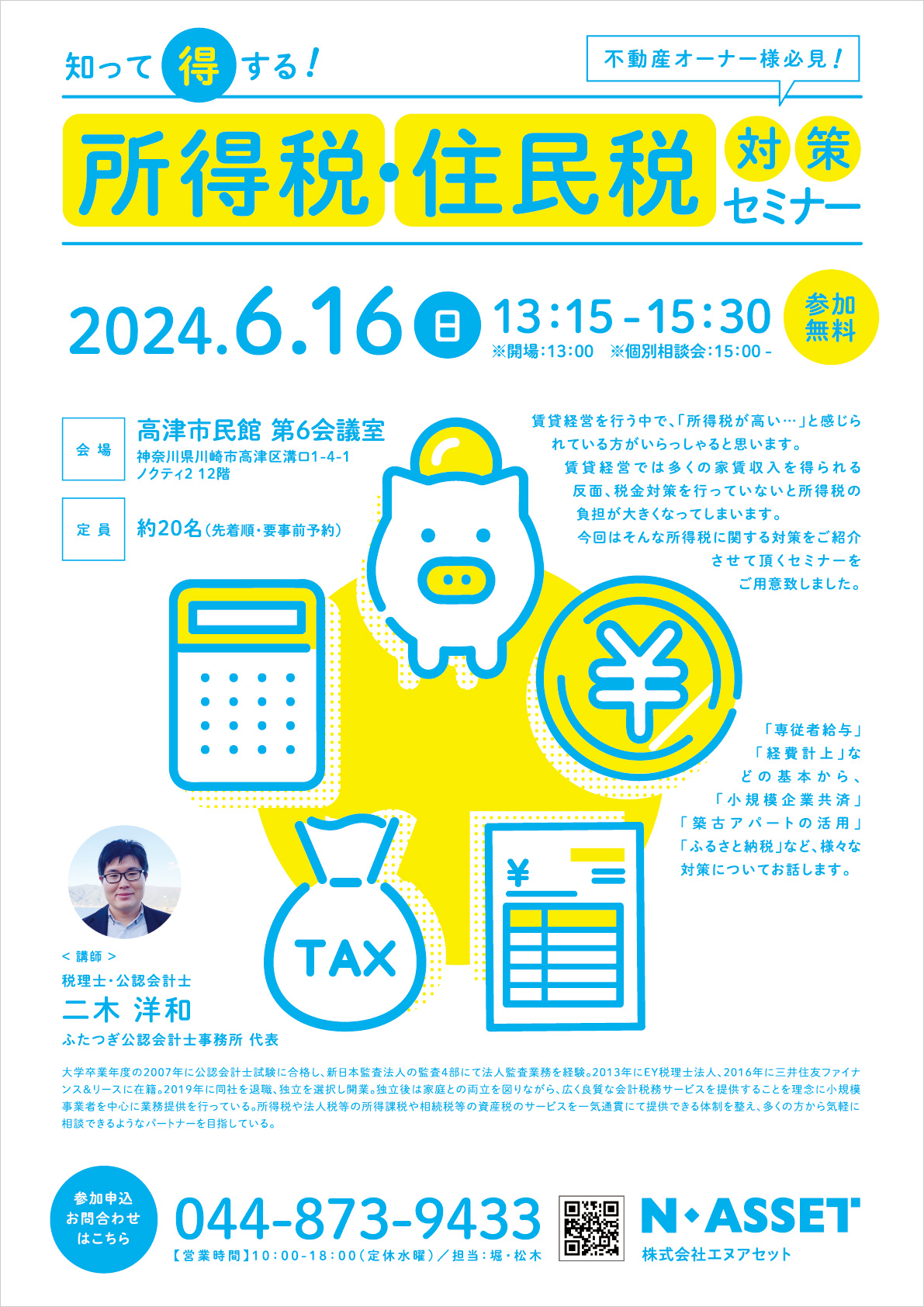 賃貸経営では多くの家賃収入を得られる反面、税金対策を行っていないと所得税の負担が大きくなってしまいます。今回はそんな所得税に関する対策をご紹介させて頂くセミナーをご用意致しました。“専従者給与”、“経費計上”などの基本から、 “小規模企業共済”、“築古アパートの活用”、“ふるさと納税”など、様々な対策についてお話します。