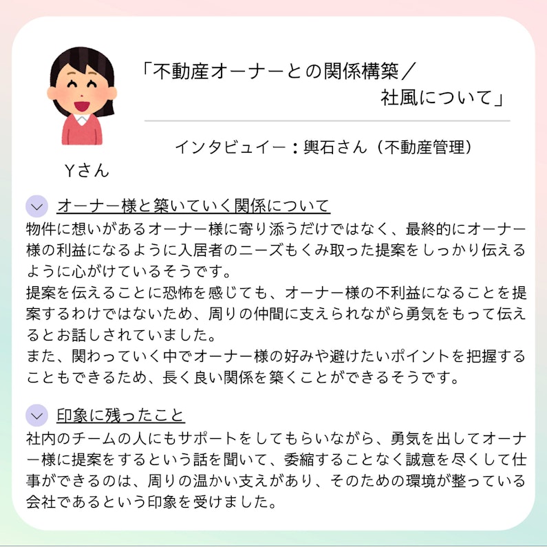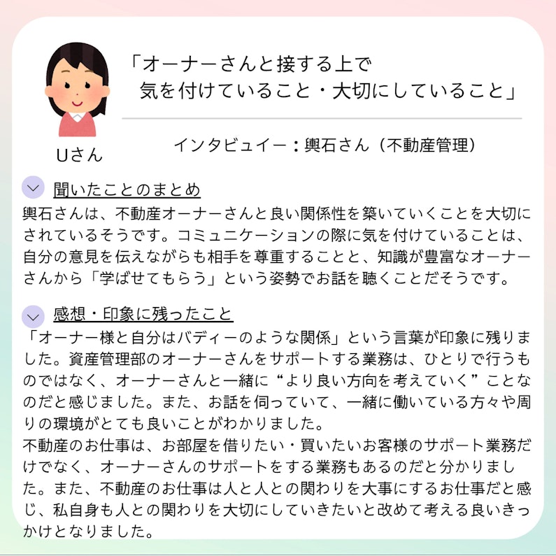 なかなか不動産管理の業務イメージが持ちづらい中で、様々な角度から質問いただきながら不動産管理の仕事の理解を深めていただけました。