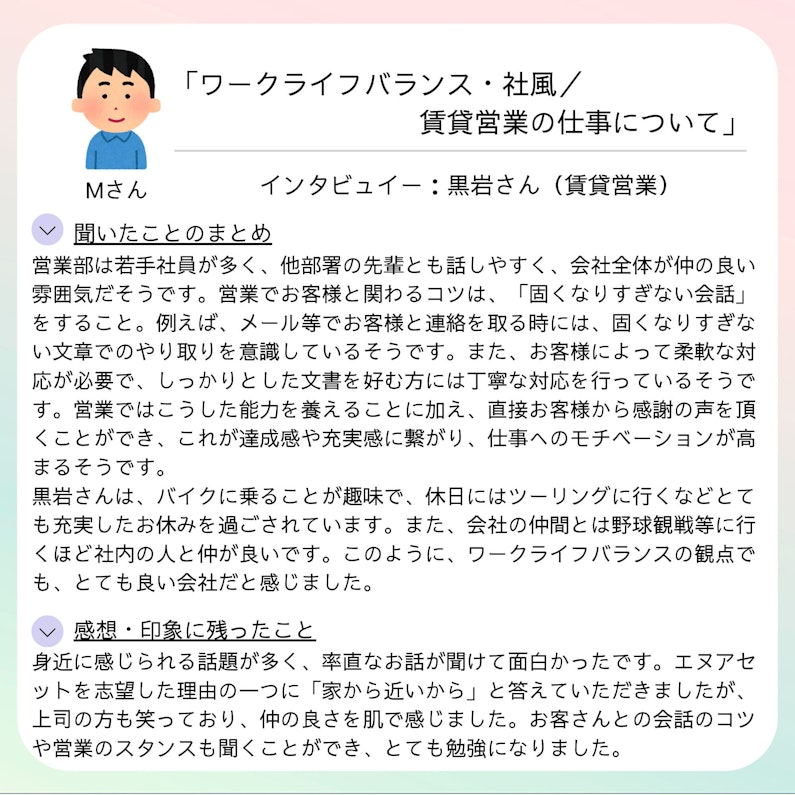 学生さんからの独自の視点で、仕事・社員についてご紹介いただき、当社の特徴が可視化されて新しい気づきがありました。