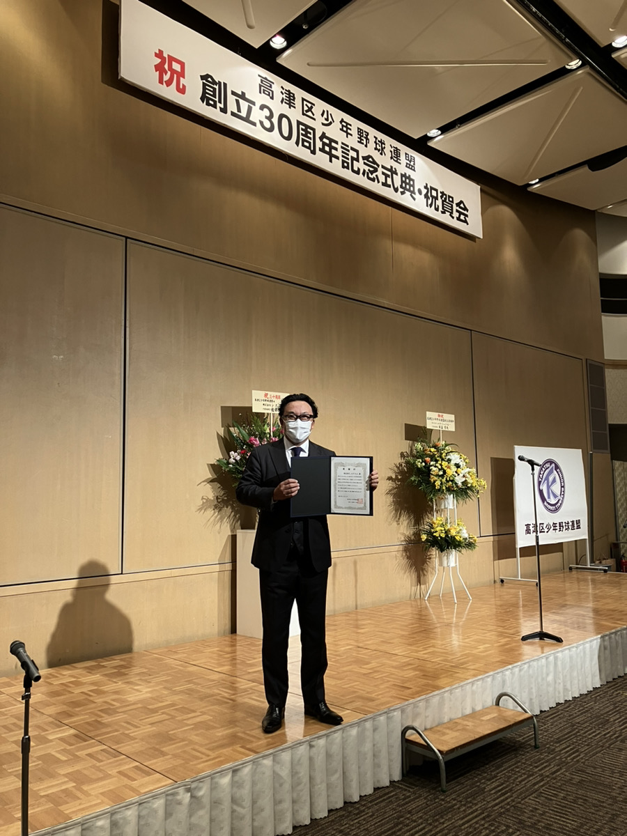 12月3日高津区少年野球連盟30周年式典、祝賀会に招待頂き、 エヌアセット杯の長年の功績(今年で12回)で、感謝状を頂きました。