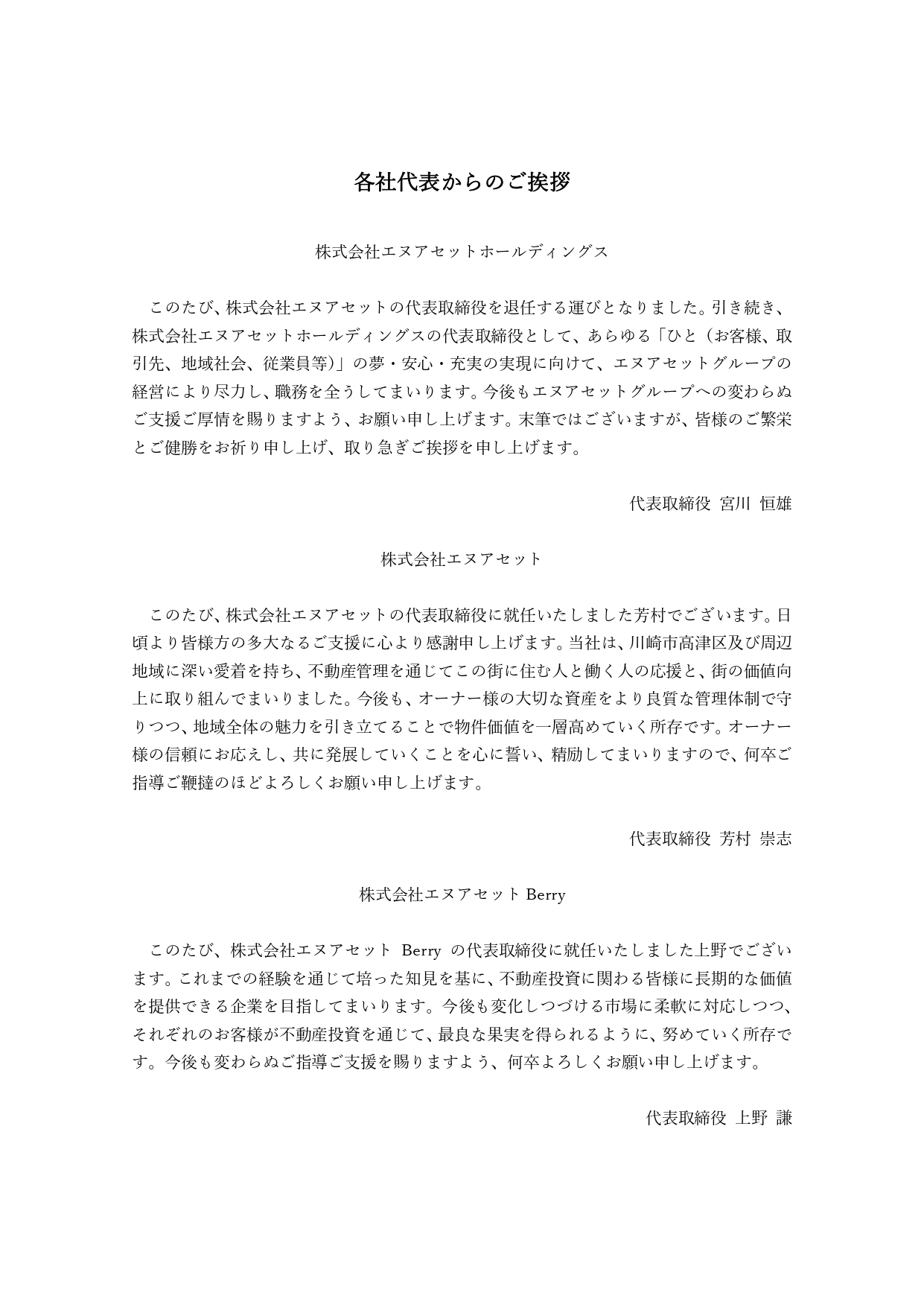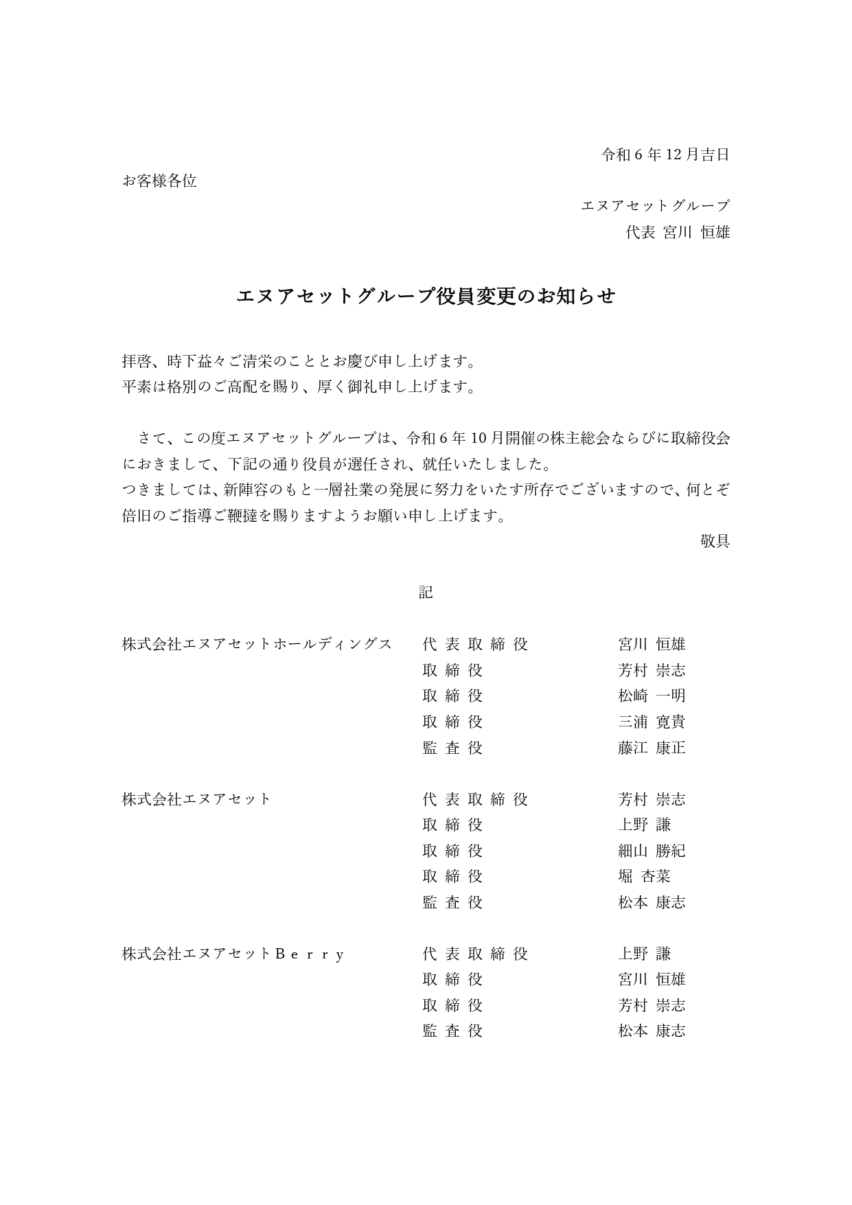 さて、このたびエヌアセットグループは、株主総会ならびに取締役会において役員が選任され、それぞれ就任いたしました。